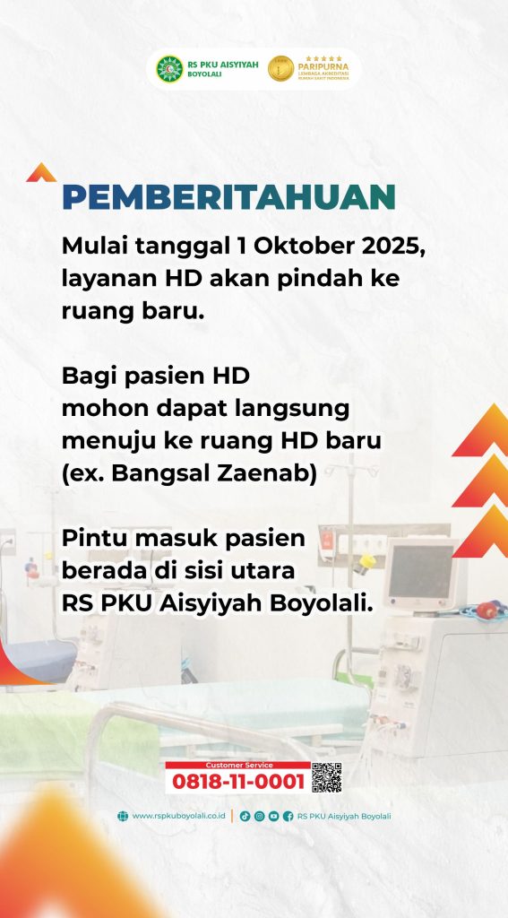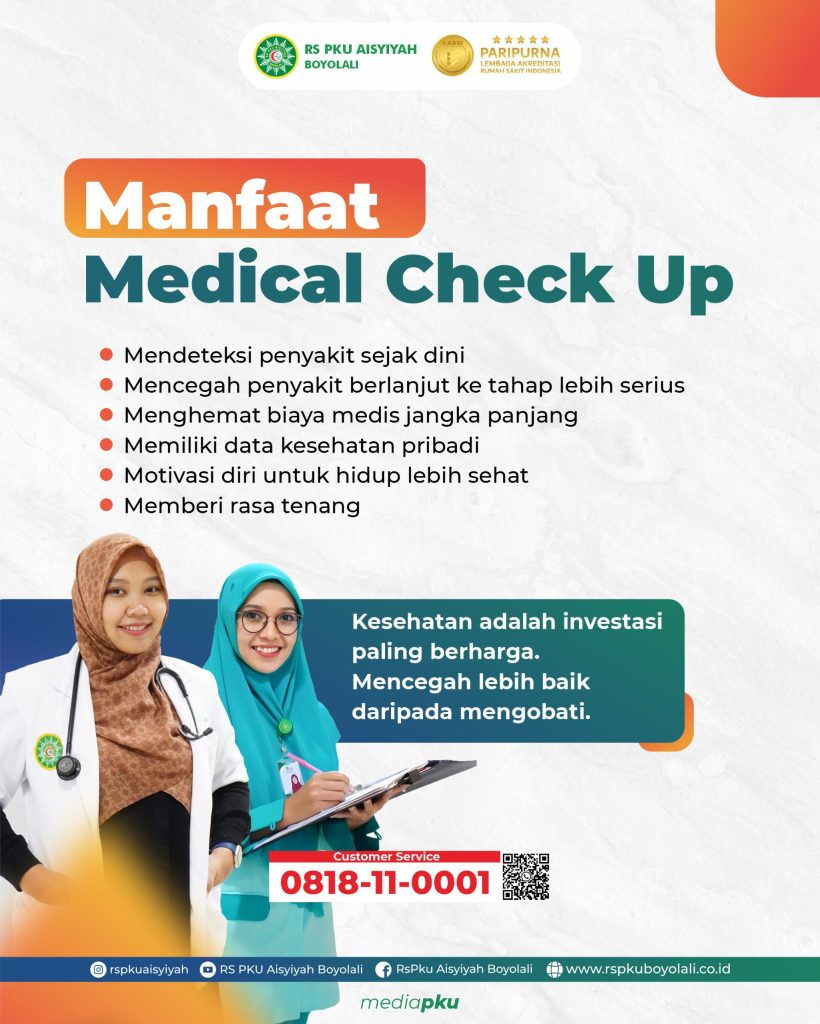 Assalamualaikum wr wb #sahabatpku 🙏 Hidup sehat, hati tenang!Medical Check Up bikin kita lebih siap menjaga kesehatan dan tetap semangat jalani aktivitas 💪Sudahkah kamu cek kesehatan hari ini? RS PKU AISYIYAH BOYOLALIJl Pasar Sapi Sapi Baru Singkil Karanggeneng Kec Boyolali Jawa Tengah 57312☎ (0276)322898📱Pendaftaran : 085702385770📱Customer Service : 0818110001🌐 www.rspkuboyolali.co.idIG : @rspkuaisyiyah Melayani Dengan Ramah dan Sepenuh Hati Wassalamu’alaikum wr wb